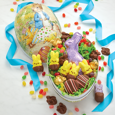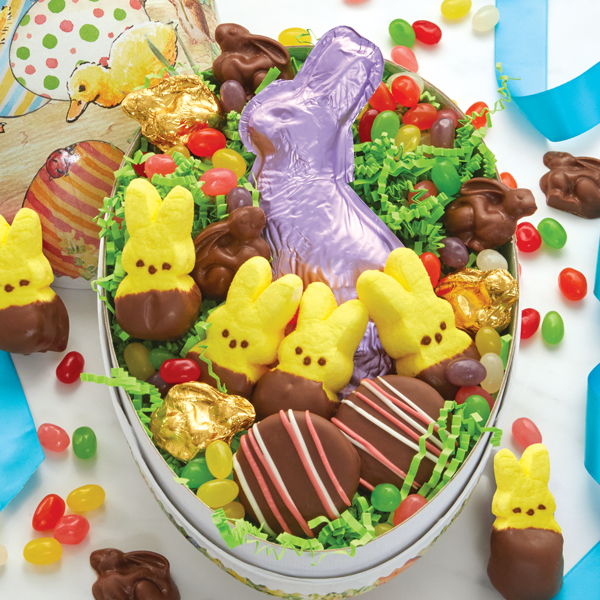 Skip the basket and crack open the fun! Our new showstopping Easter Egg is brimming with springtime favorites - rainbow jelly beans, four milk chocolate-dipped Peeps, a 6 oz. solid milk rabbit in colorful foil, two chocolate-covered Oreos, and twelve milk chocolate Moon Bunnies. A festive centerpiece - and delicious gift all in one!